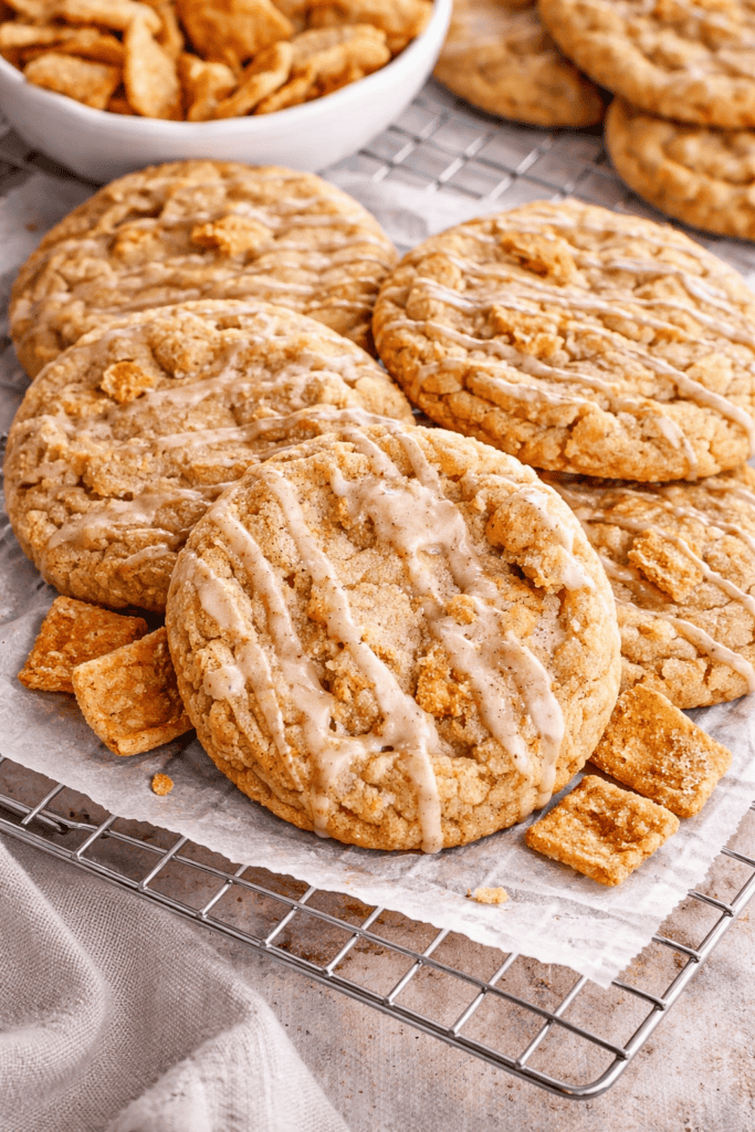 Cinnamon Toast Crunch Cookies are soft and chewy cookies made with crushed Cinnamon Toast Crunch cereal mixed directly into the dough. The cereal adds cinnamon flavor and a subtle crunch, while a cinnamon glaze drizzled on top enhances the sweetness and gives them a bakery-style finish.