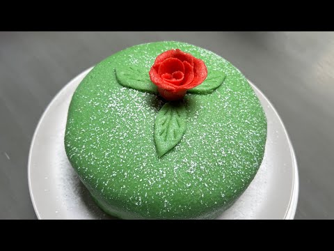 Next, sprinkle your workspace with powdered sugar and roll out the green fondant so it will fit over your entire Swedish Princess Cake. When it's the size you need, carefully wrap the fondant around your rolling pin to easily transfer it to the cake.